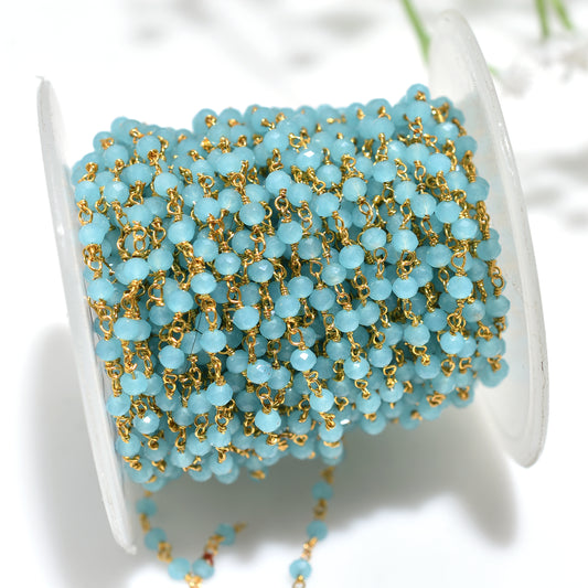Handcrafted Blue Chalcedony Hydro Faceted Gemstone Beads Rosary Chain Gold Plated Linking Chains for DIY Crafts
