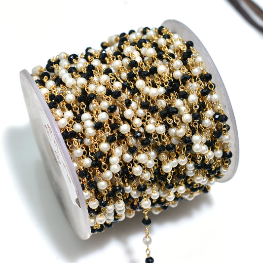 Classic Pearl & Black Onyx Rosary - Wholesale Golden Wire Wrapped Gemstone Chain Lot