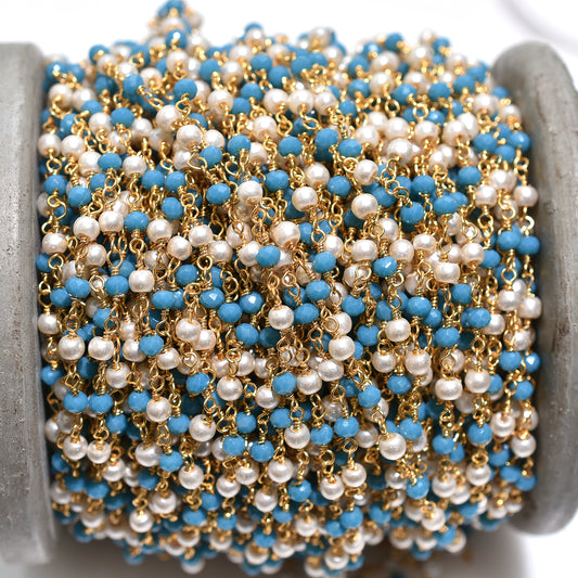 Ocean Glow Pearl & Blue Turquoise Rosary Chain – Hydro Gemstone Beads with Gold Plated Links For DIY Jewelry