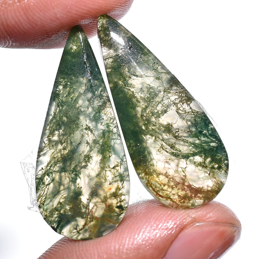 Top! Green Moss Agate Cabochon Pair - Pear Shaped Agate Matching Pair