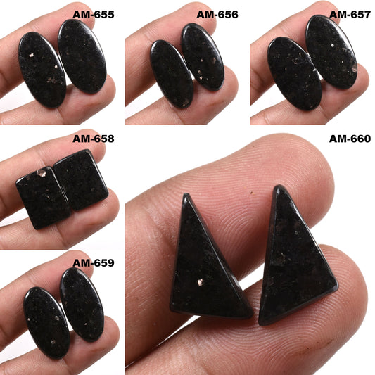 Black Nuummite Cabochon Earrings Pair – Top Quality Greenland Nuummite with Golden Sparkles