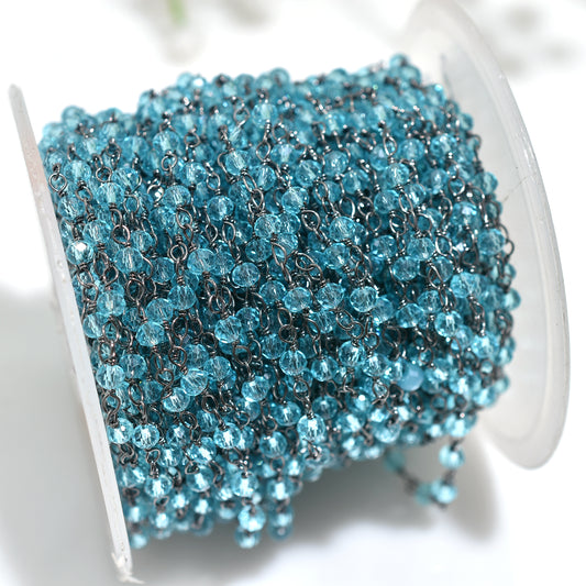 Blue Topaz Hydro Rondelle Rosary Chain Wire Wrapped Black Metal Plated Stone Beaded Chain for Jewelry Making