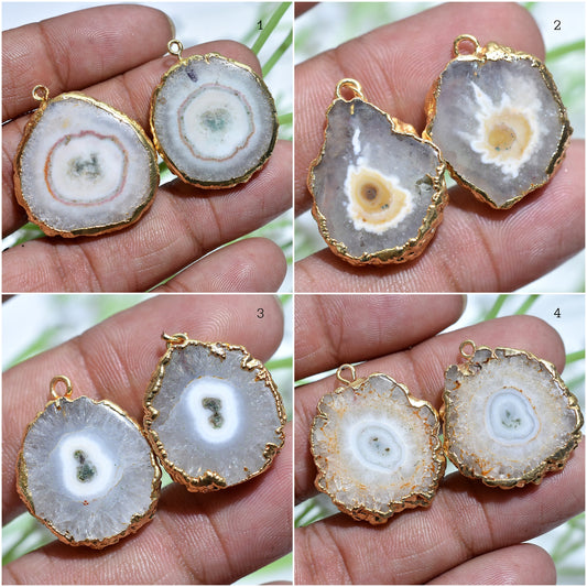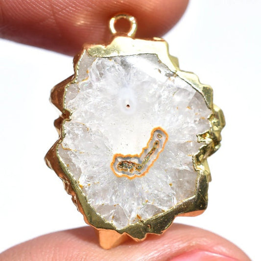 Fancy White Window Agate Druzy Slice Pendant - Gold Electroplated Solar Quartz Crystal for Jewelry