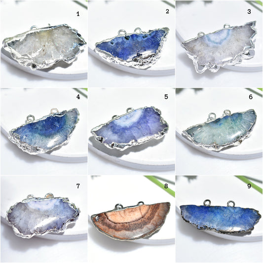 Blue Druzy Agate Charms - Double Bail Geode Agate Slice, Silver Electroplated Connectors