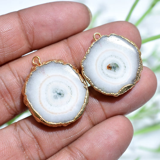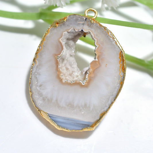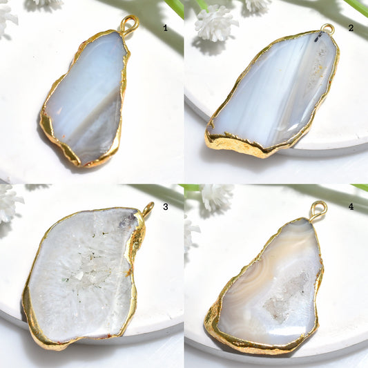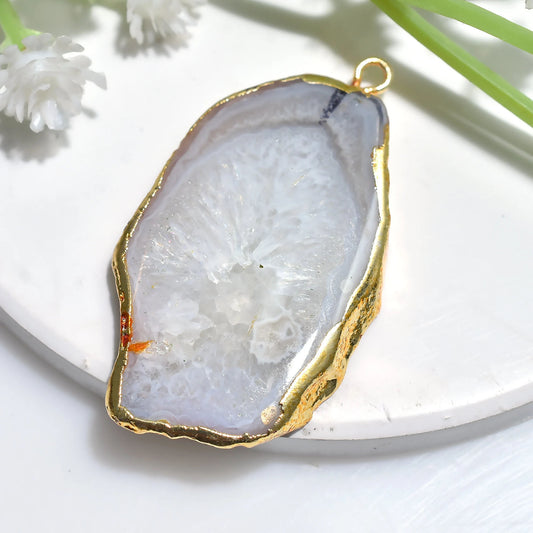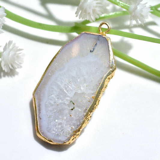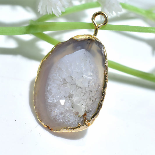 Beautiful Druzy Agate Gemstone Pendant - White Solar Quartz Gold Electroplated Geode Slice for DIY Jewelry