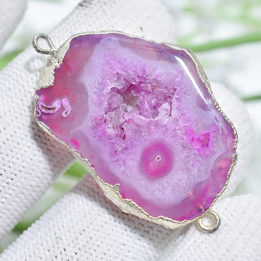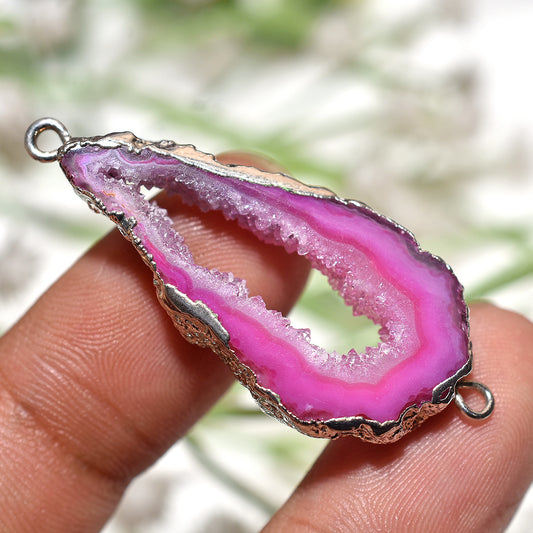 Beautiful Pink Window Druzy Solar Quartz Double Bail Connector- Wholesale Silver Electroplated Connector Supply
