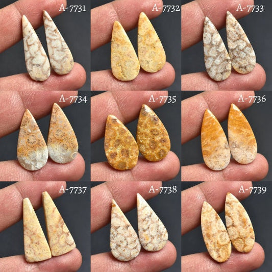 Fossil Coral Cabochon Pair – Pear Shaped Smooth Gemstone for Earrings, Matched Pair