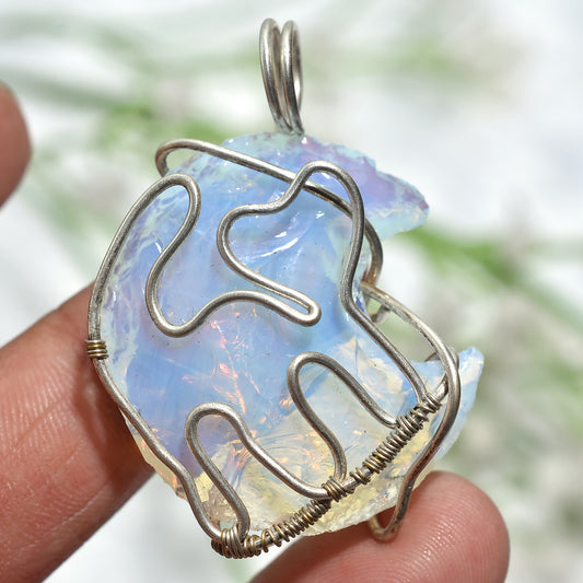 Luminous Opalite Wire Wrapped Pendant – Handmade Artisan Stone Jewelry(25x45x6mm,/59ct)