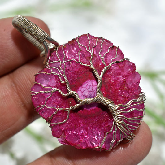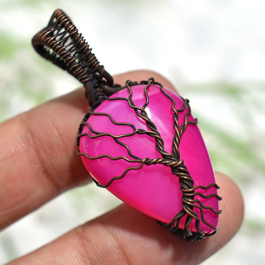 Fuchsia Pink Agate Tree of Life Pendant – Oxidise Copper Wire Wrap Gemstone Jewelry(18x43x5mm,44/ct)