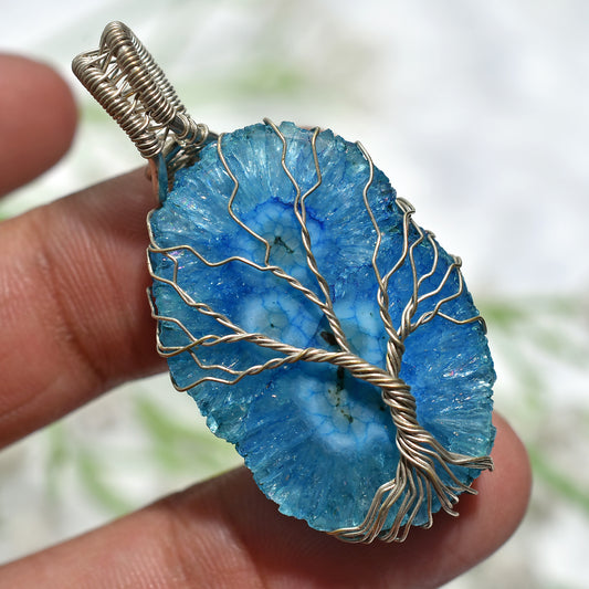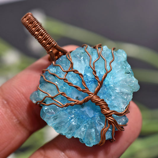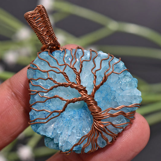 Mystical Blue Druzy Quartz Pendant – Wire Wrapped Energy Stone Necklace(25x40x7mm,/48ct)