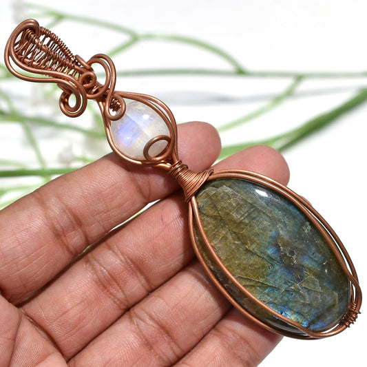 Labradorite & Moonstone Pendant – Copper Wire Wrapped Healing Crystal(28x111x10mm,/175)
