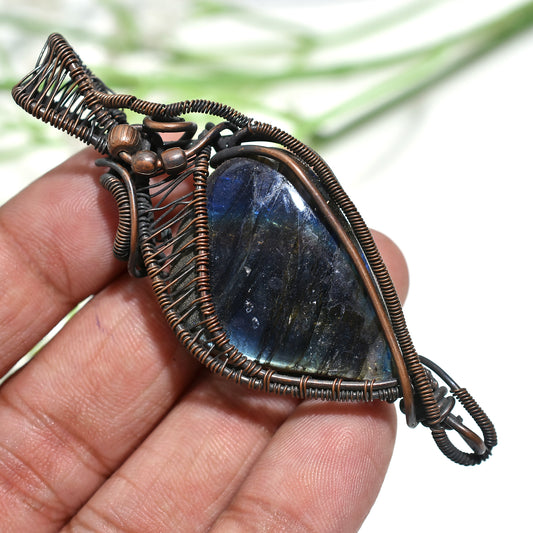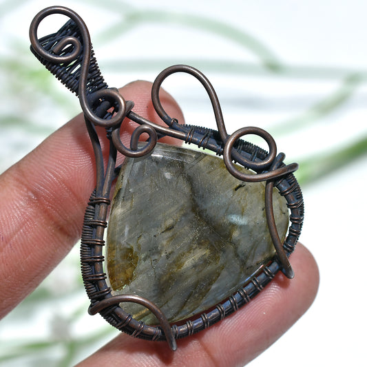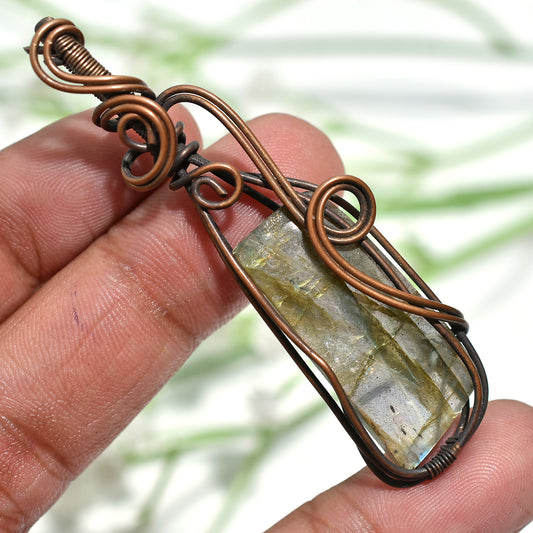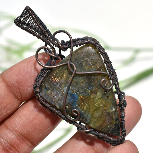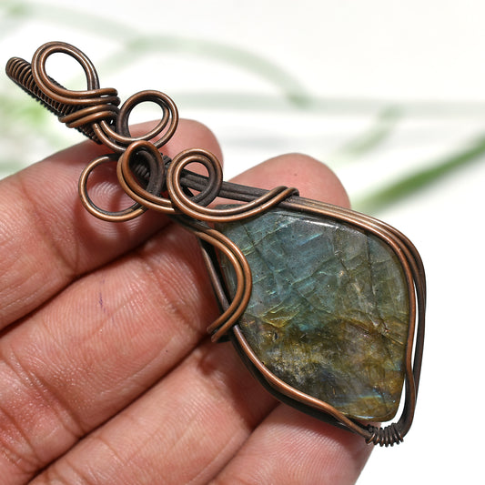 Artisan Fire Flash Labradorite Gemstone Pendant – Copper Wire Wrapped Jewelry(17x65x5mm,/45ct)