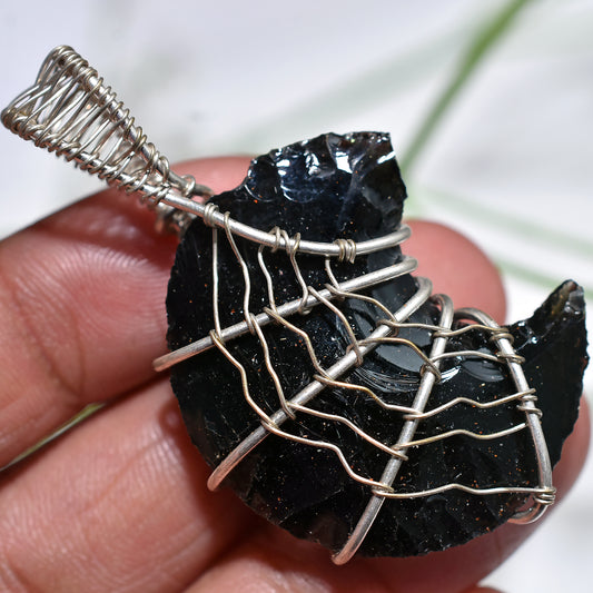 Handcrafted Black Obsidian Crescent Moon Pendant β Unique Wire Wrapped Healing Necklace