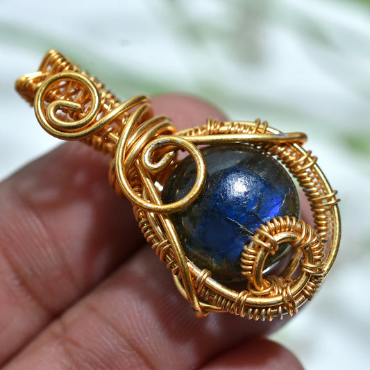 Trending Labradorite Golden Wire Wrapped Pendant Round Flashy Stone Necklace Jewelry (10x35x7mm,/31ct)