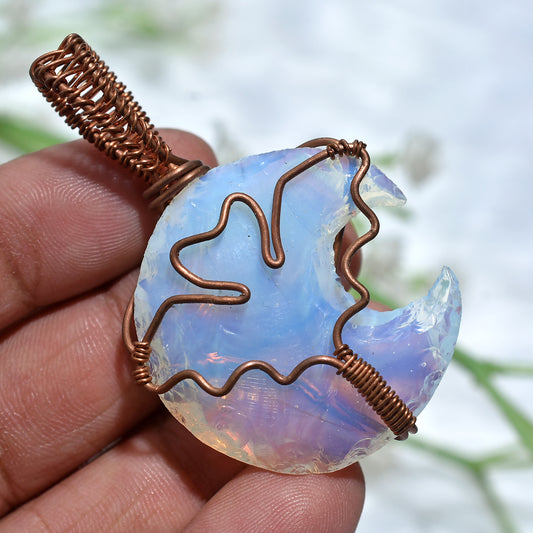 Elegant Opalite Crescent Moon Gemstone Pendant Copper Wire Wrapped Crystal (22x55x5mm,/61ct)