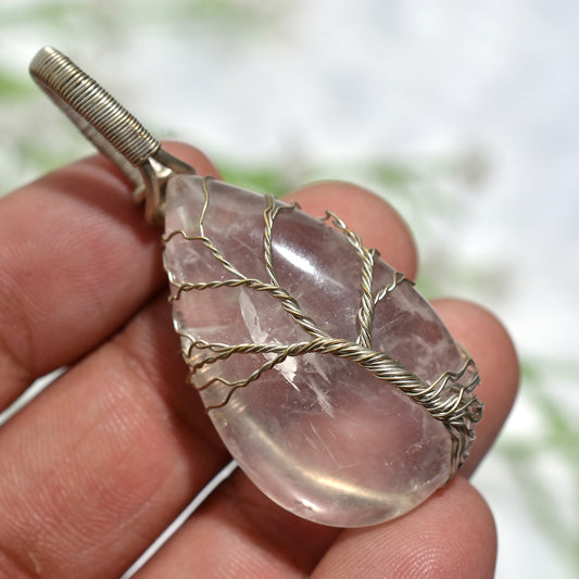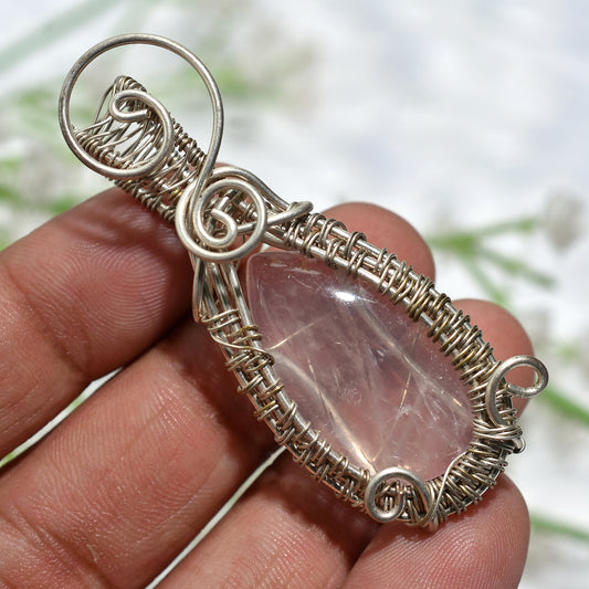 Elegant Silver Wire Wrapped Rose Quartz Pendant β Handmade Healing Crystal Jewelry(30x65x8mm,/101ct)