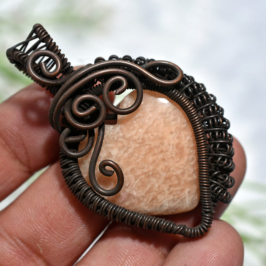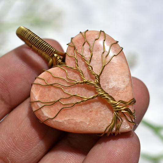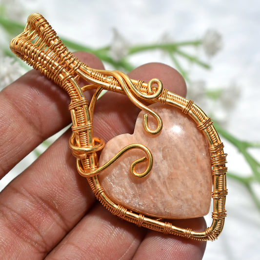 Artisan Golden Wire Wrapped Peach Moonstone Heart Pendant (32x47x6mm,/72ct)