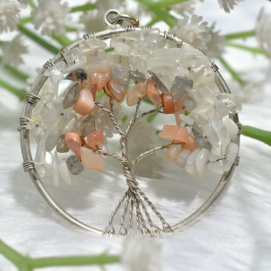 Awesome Peach Moonstone & White Crystal Tree of Life Pendant β Bohemian Silver Wire Wrapped Jewelry(42x50x4mm,/51ct)
