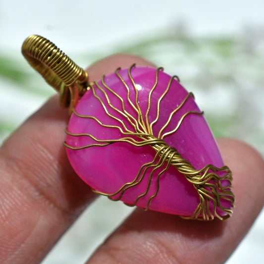 Handmade Pink Agate Tree of Life Pendant β Golden Wire Wrapped Gemstone Necklace(20x40x5mm,/35ct)