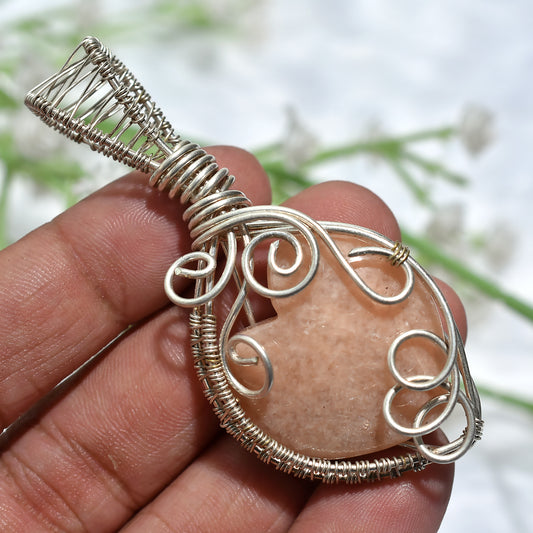 Romantic Peach Moonstone Heart Pendantβ Handmade Silver Wire Wrapping Jewelry(28x65x8mm,/76ct)