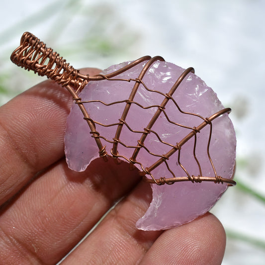 Natural Rose Quartz Crescent Moon Gemstone -Copper Wire Wrapped Pendant Jewelry(23x52x4mm,/60ct)