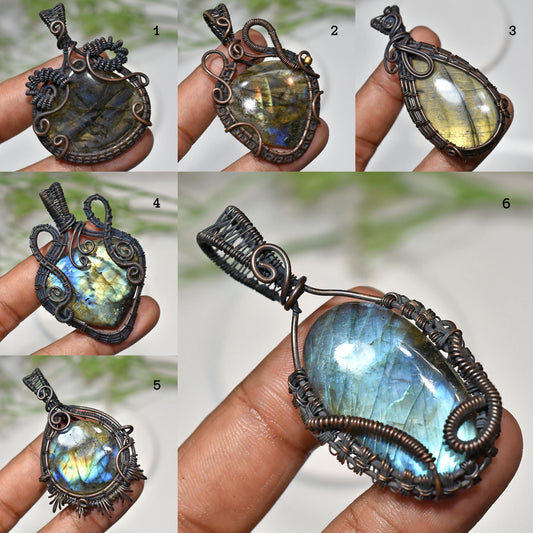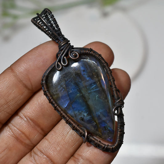 Flashy Labradorite Pendant – Handmade Wire-Wrapped Copper Necklace at Wholesale Price