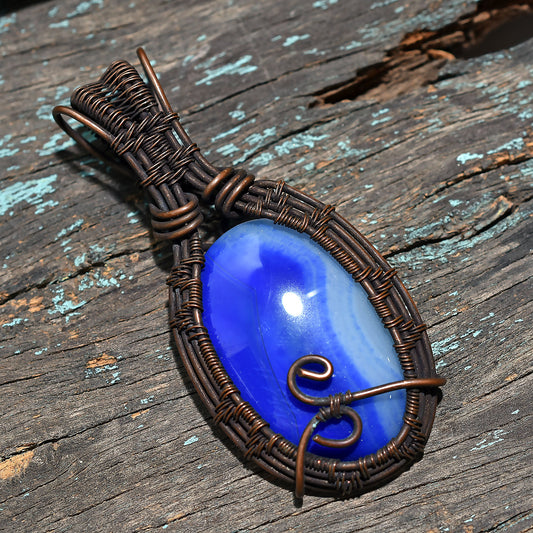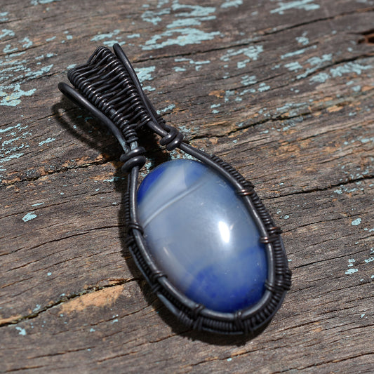 Blue Botswana Agate Pendant Oxidized Copper Wire Wrapped Handmade Wholesale Gemstone Necklace