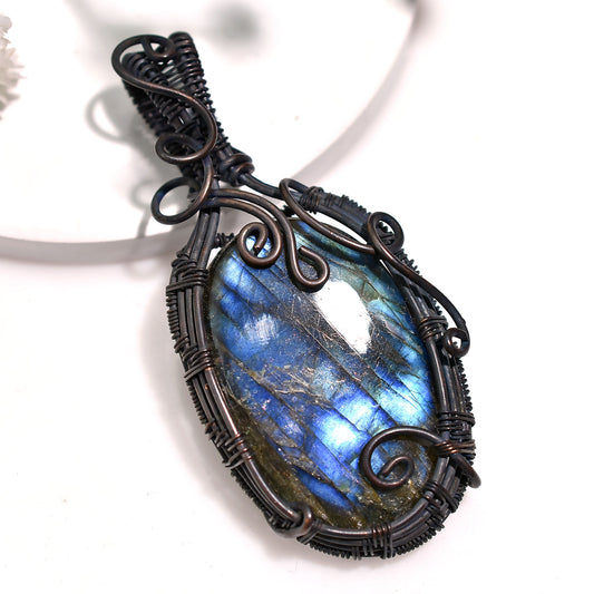 BLUE Flashy Labradorite Pendant – Dark Copper Wire Wrapped Wholesale Stone Jewelry 110ct
