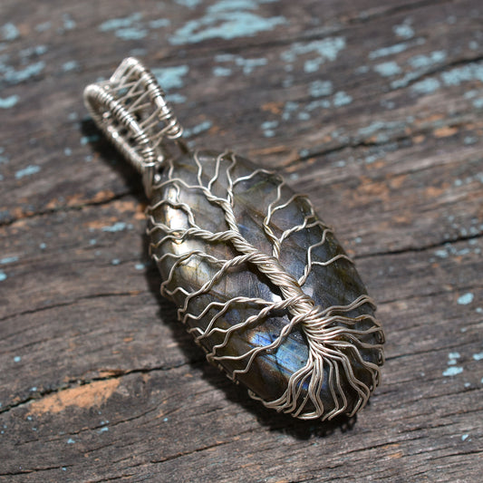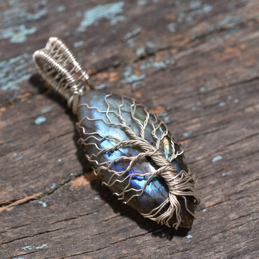 Natural Labradorite Tree of Life Necklace Pendant – Artisan Handmade Silver Wire Wrapped Gemstone