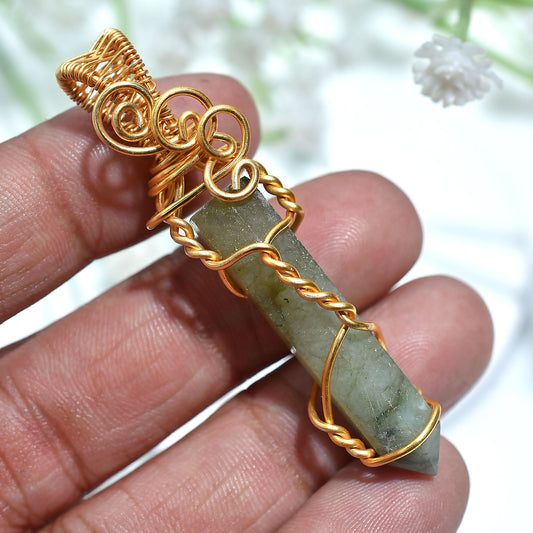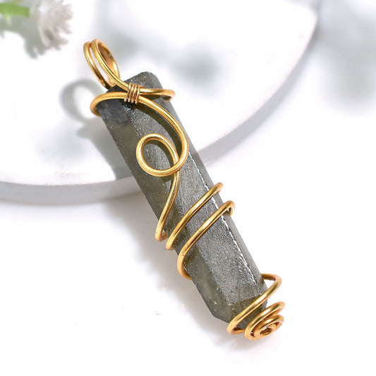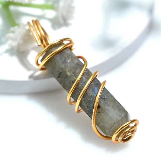 Handmade Labradorite Pencil Pendant – Golden Wire Wrapped Crystal Stone Necklace 38ct