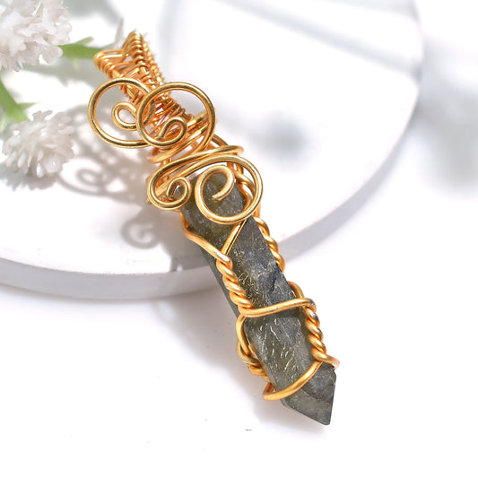 Luxury Labradorite Tower Stone – Handmade Golden Wire Wrapped Pencil Pendant 34ct