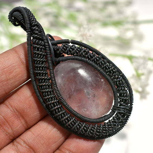 Sparkling Pink Solar Quartz Pendant β Silver Wire Wrapped Statement Gemstone Jewellery( 22x42x5mm,/52ct )