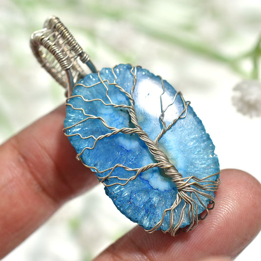 Handcrafted Blue Solar Quartz Pendant β Silver Wire Wrapped Statement Gemstone Jewellery(21x43x5mm,/49ct)