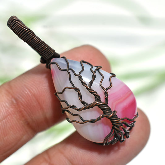 Elegant Pink Botswana Pendant β Oxidise Copper Wire Wrap Gemstone Jewellery (17x40x7mm,/36ct)