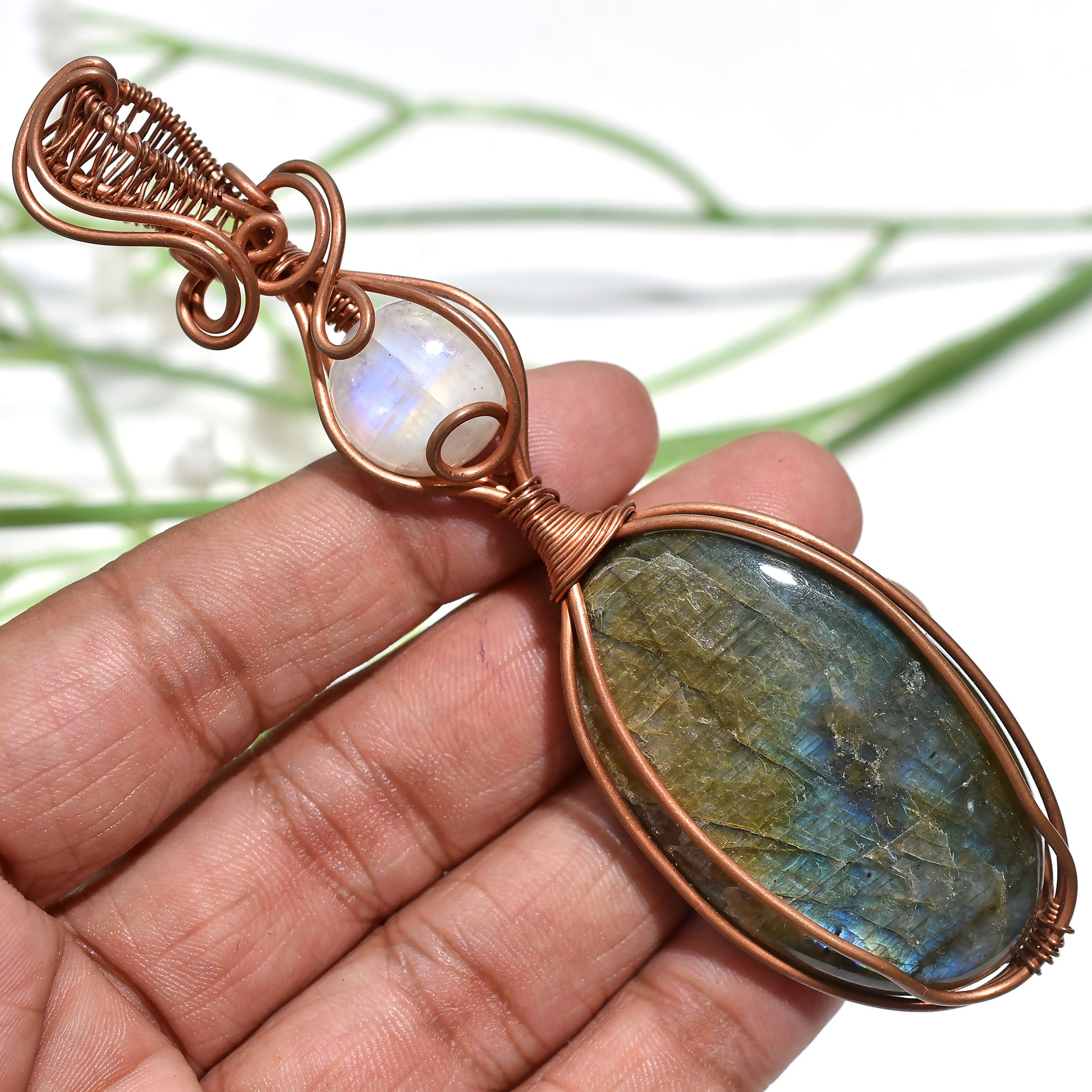 A Labradorite and Moonstone wire-wrapped pendant, blending mystical energies in a beautifully handcrafted copper setting