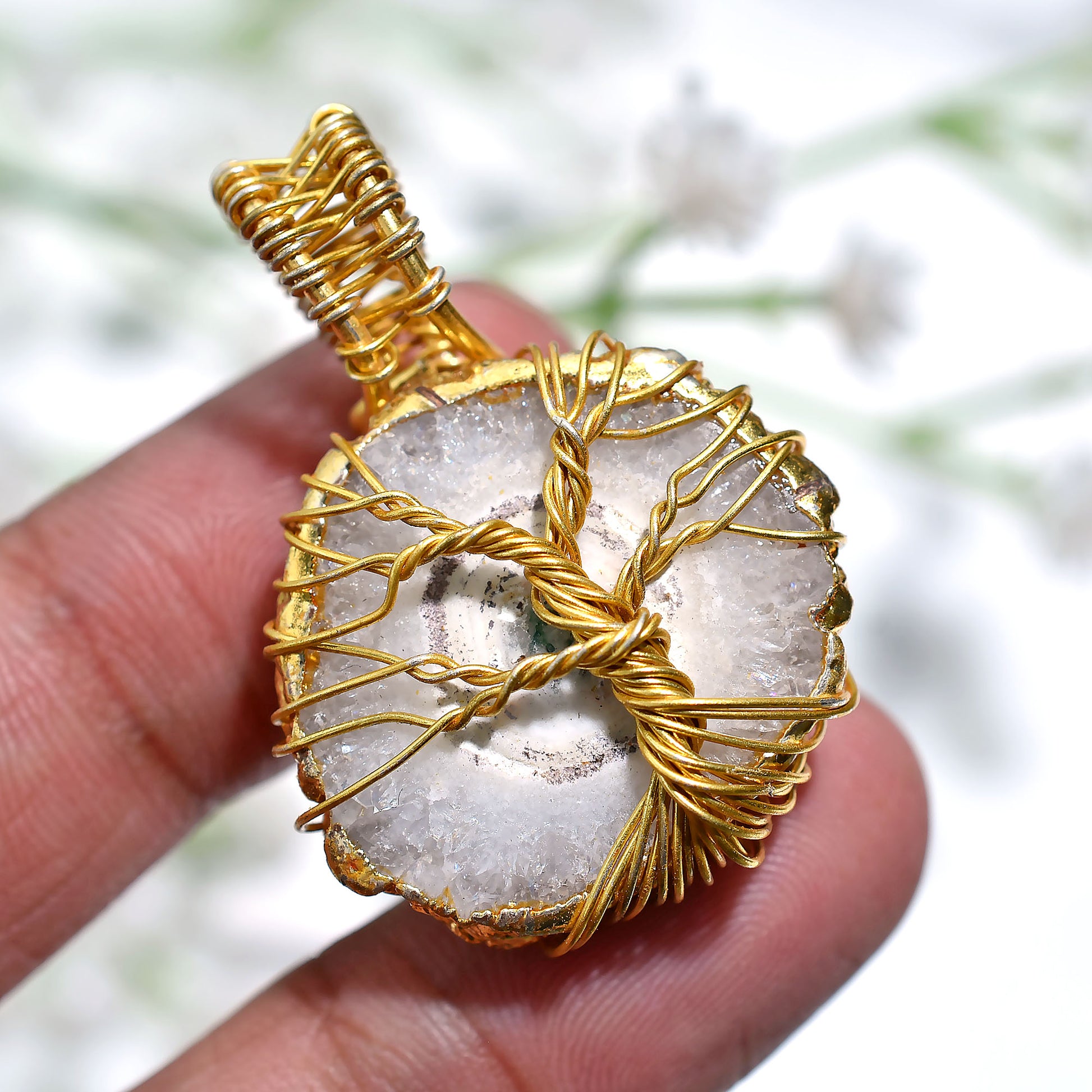 Elevate your style with this Elegant Solar Quartz Pendant, beautifully gold electroplated and wrapped in Golden wire. A unique handcrafted piece symbolizing clarity, energy, and spiritual balance – perfect for crystal lovers and boho-chic fashion.