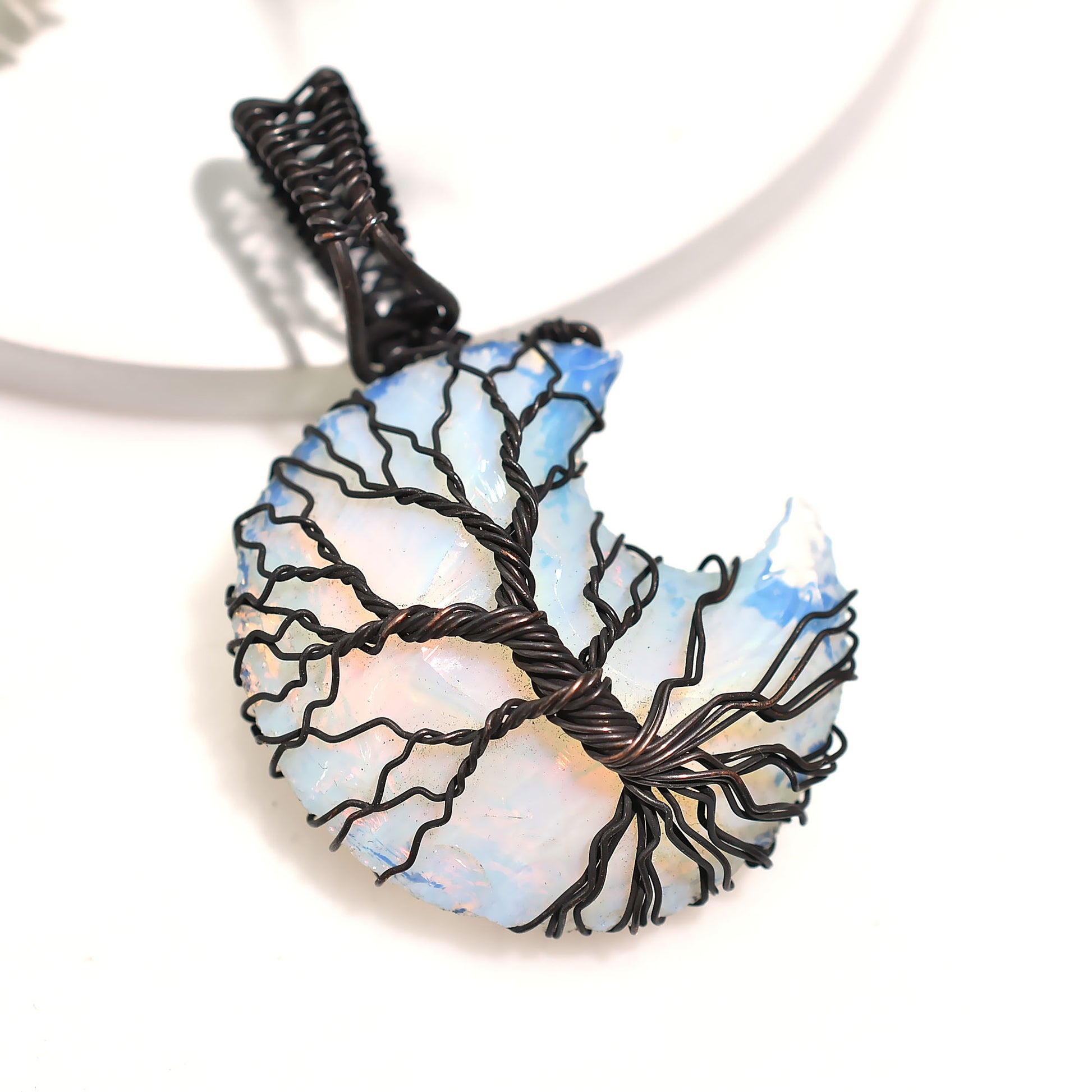 Step into celestial beauty with this Crescent Moon Opalite Pendant, wire wrapped with care and intention. Opalite is a calming and spiritual stone that promotes clarity, intuition, and emotional healing. Its ethereal glow and moon shape make it a symbol of feminine energy and inner magic. Perfect for gifting, rituals, or daily wear, this pendant brings a soft yet powerful presence to your energy and your outfit.