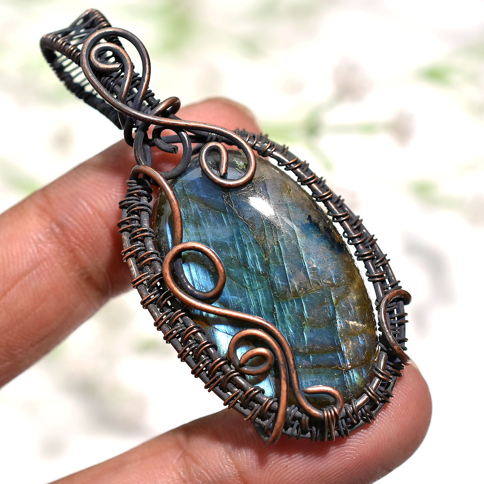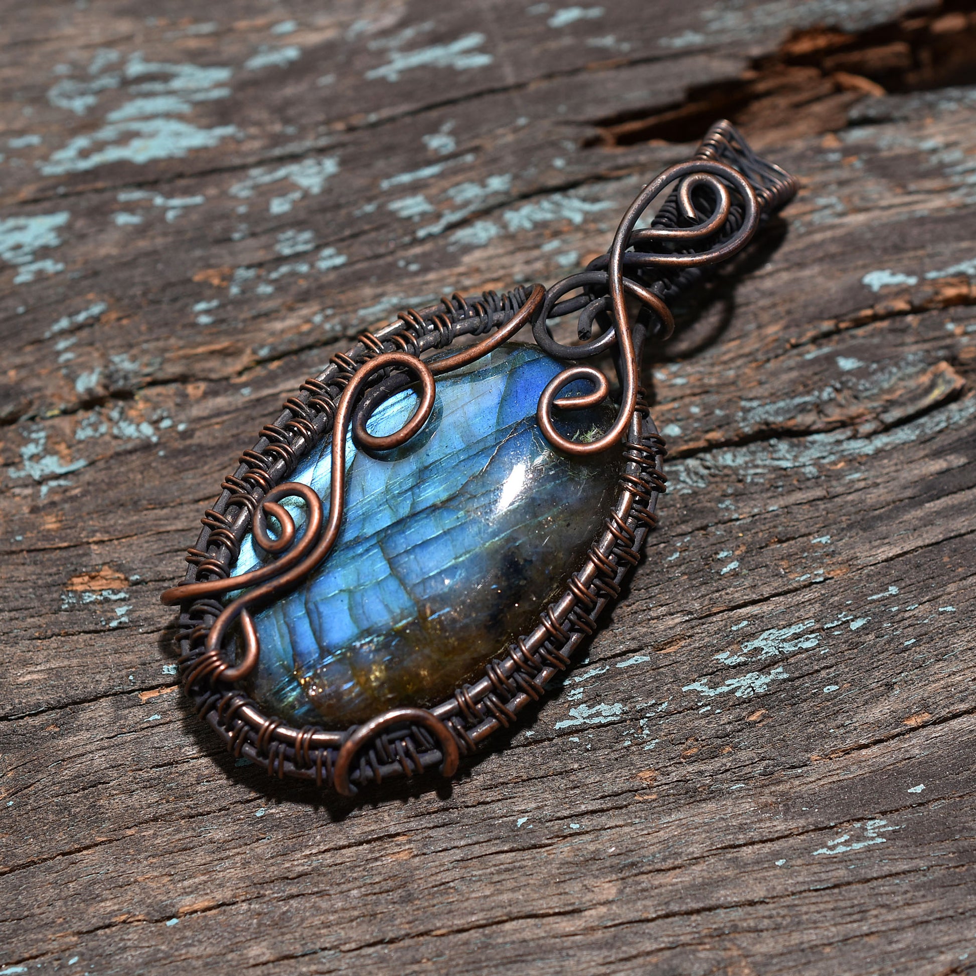 Showcasing vibrant blue flashes, this handcrafted Labradorite pendant is wrapped in copper wire with artistic flair. A spiritual gemstone necklace, perfect for wholesale and personal wear.