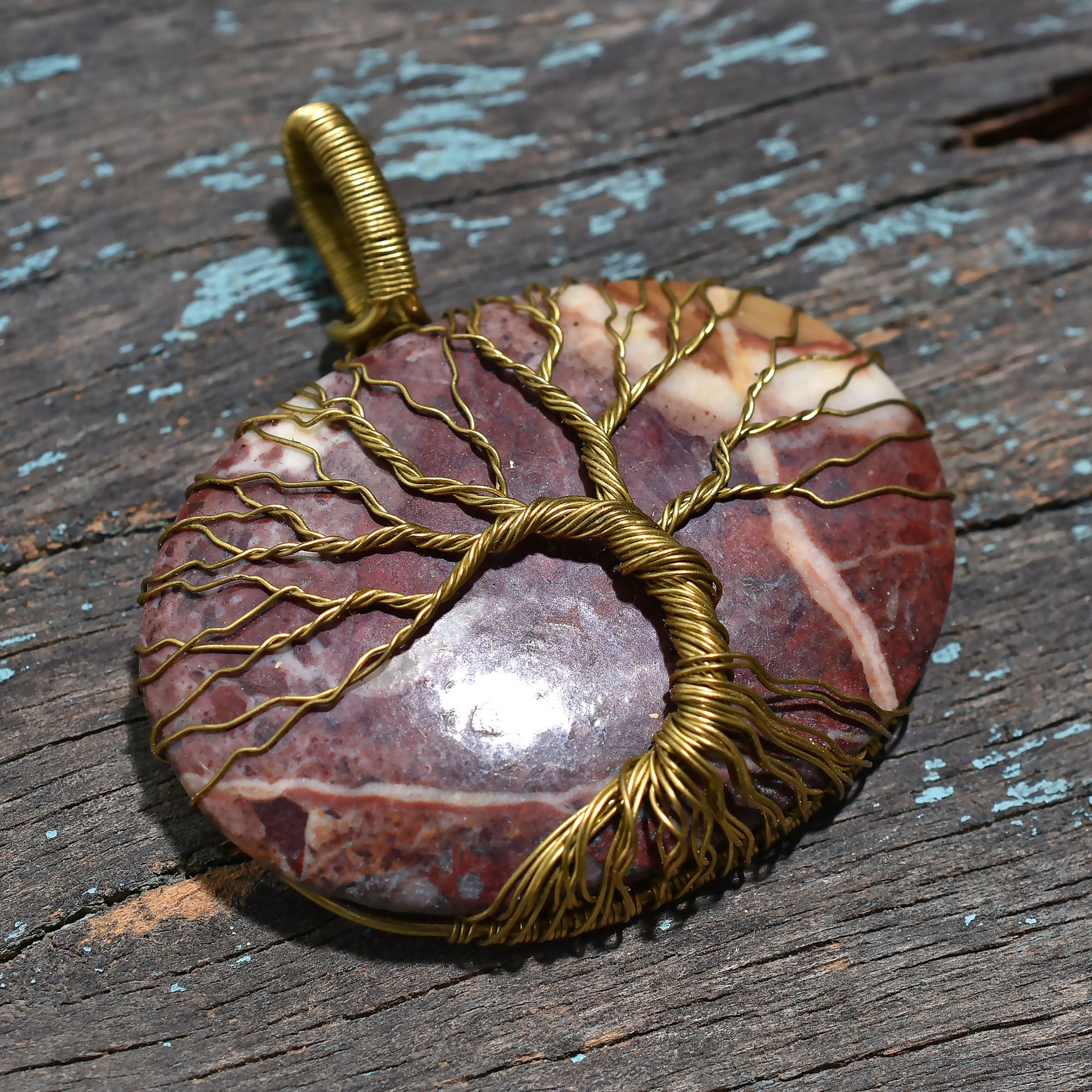 Natural Mookaite Jasper Pendant wrapped in gold wire – earthy tones, grounding energy, and handmade boho-style healing jewelry.