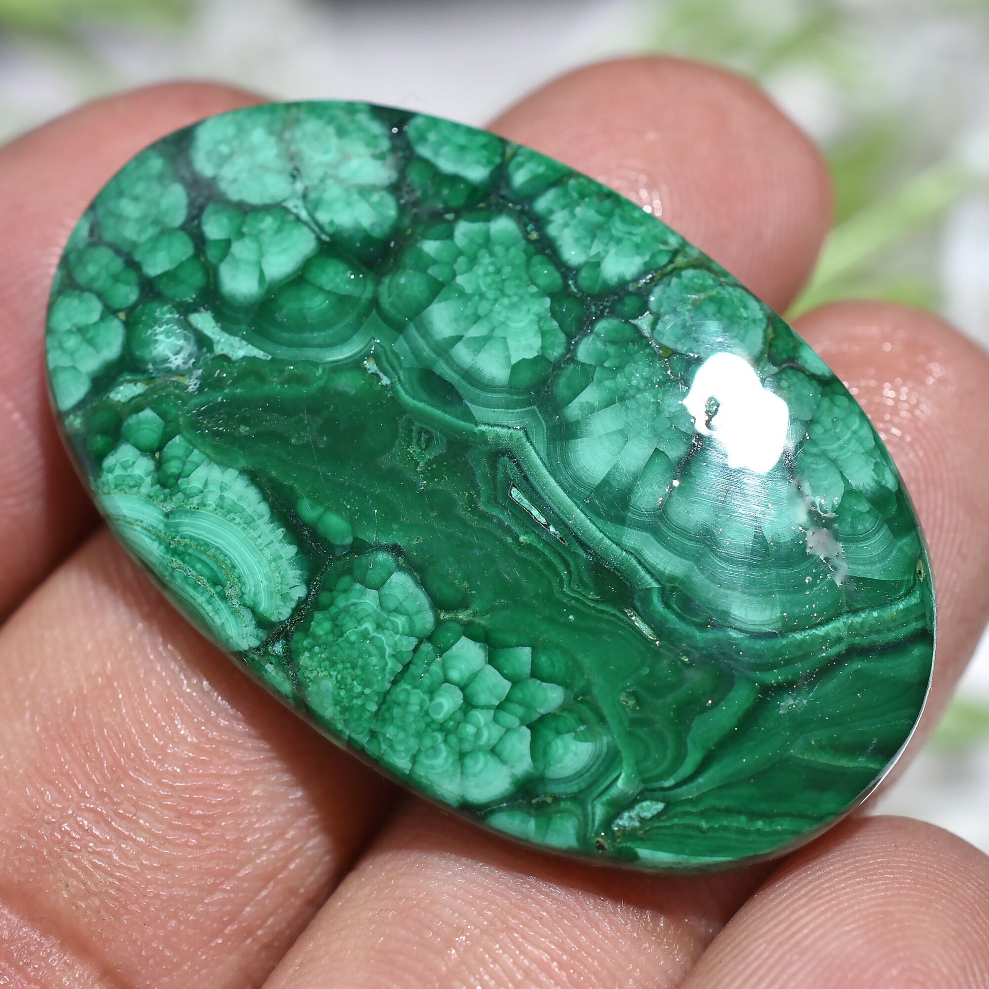 Shop a beautiful green malachite oval-shaped gemstone, natural and smooth. Perfect for custom designs, this designer malachite cabochon also serves as a powerful healing crystal.