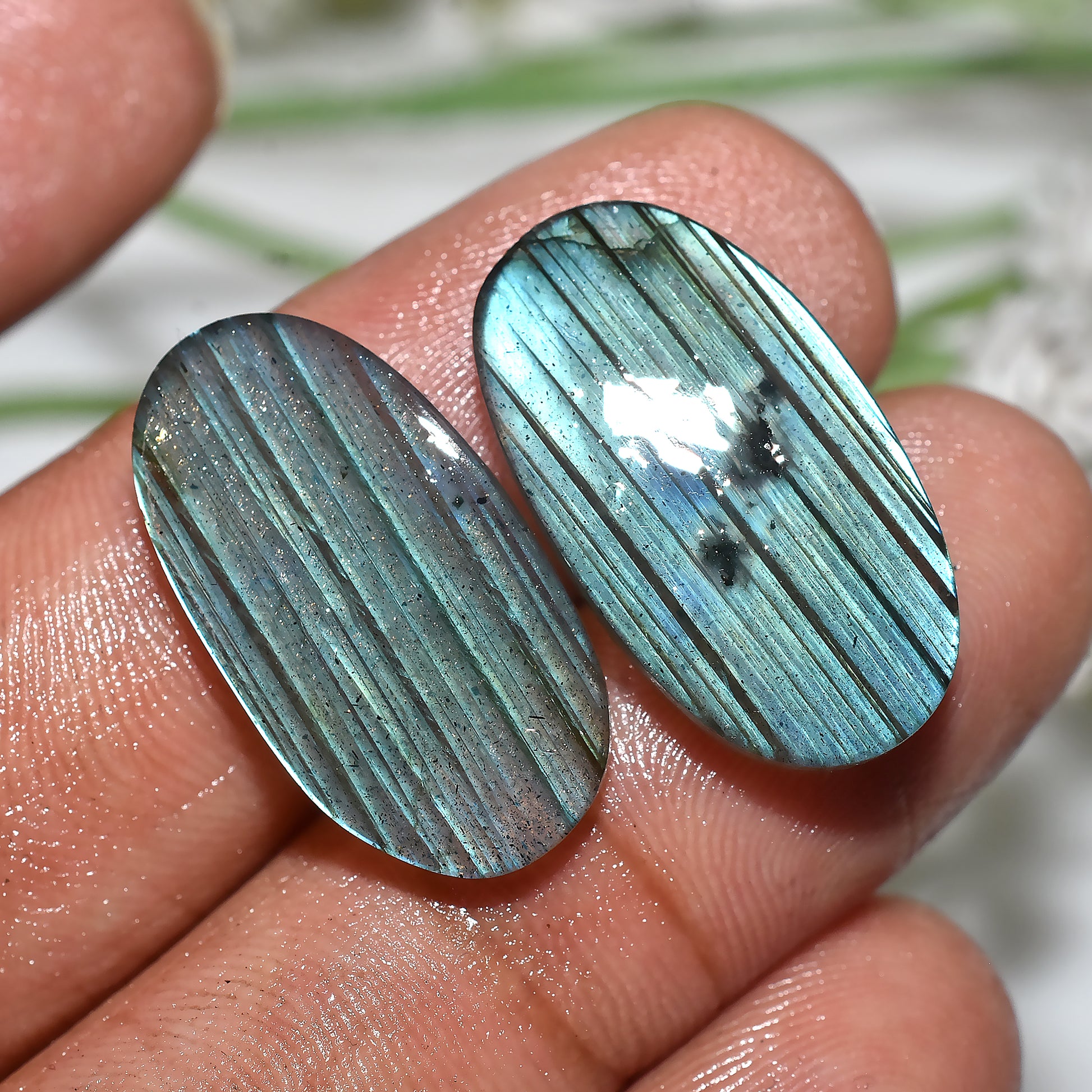 Natural Labradorite gemstone pair, polished and ready for handmade jewelry making and designer collections.