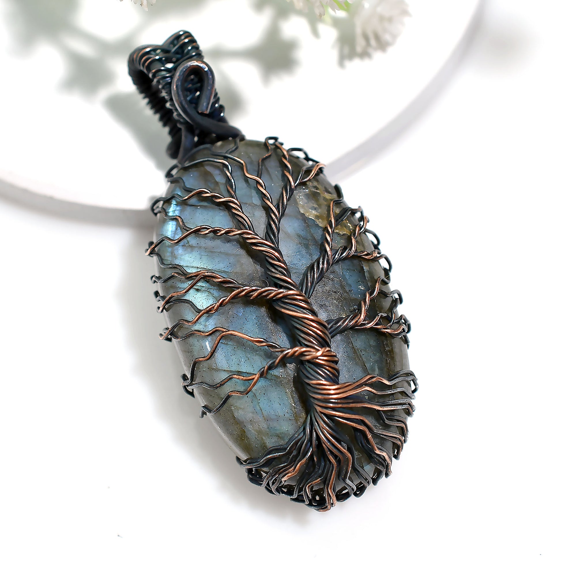 This stunning Labradorite pendant is skillfully wrapped in oxidized copper wire, giving it a unique rustic and vintage aesthetic. Labradorite is a powerful energy stone, known for its protective and intuitive properties. A perfect bohemian necklace for meditation, healing, and daily wear.