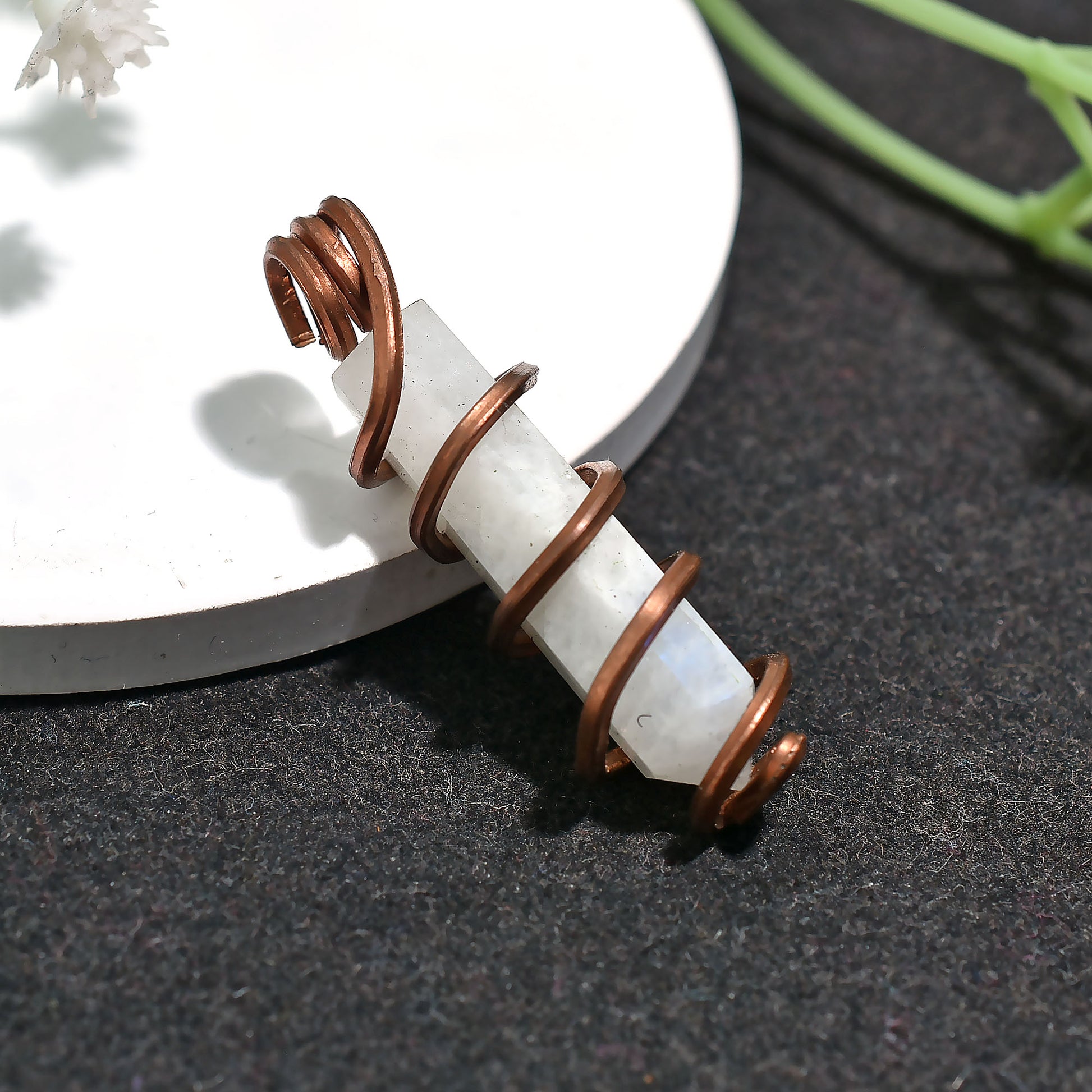 Enhance your energy with this Copper Wire Wrapped Rainbow Moonstone Pencil Pendant. Crafted with natural moonstone, this healing crystal pendant is perfect for chakra balancing, reiki, and meditation. The boho-inspired copper wire wrapping adds an elegant touch, making it a unique spiritual jewelry piece.