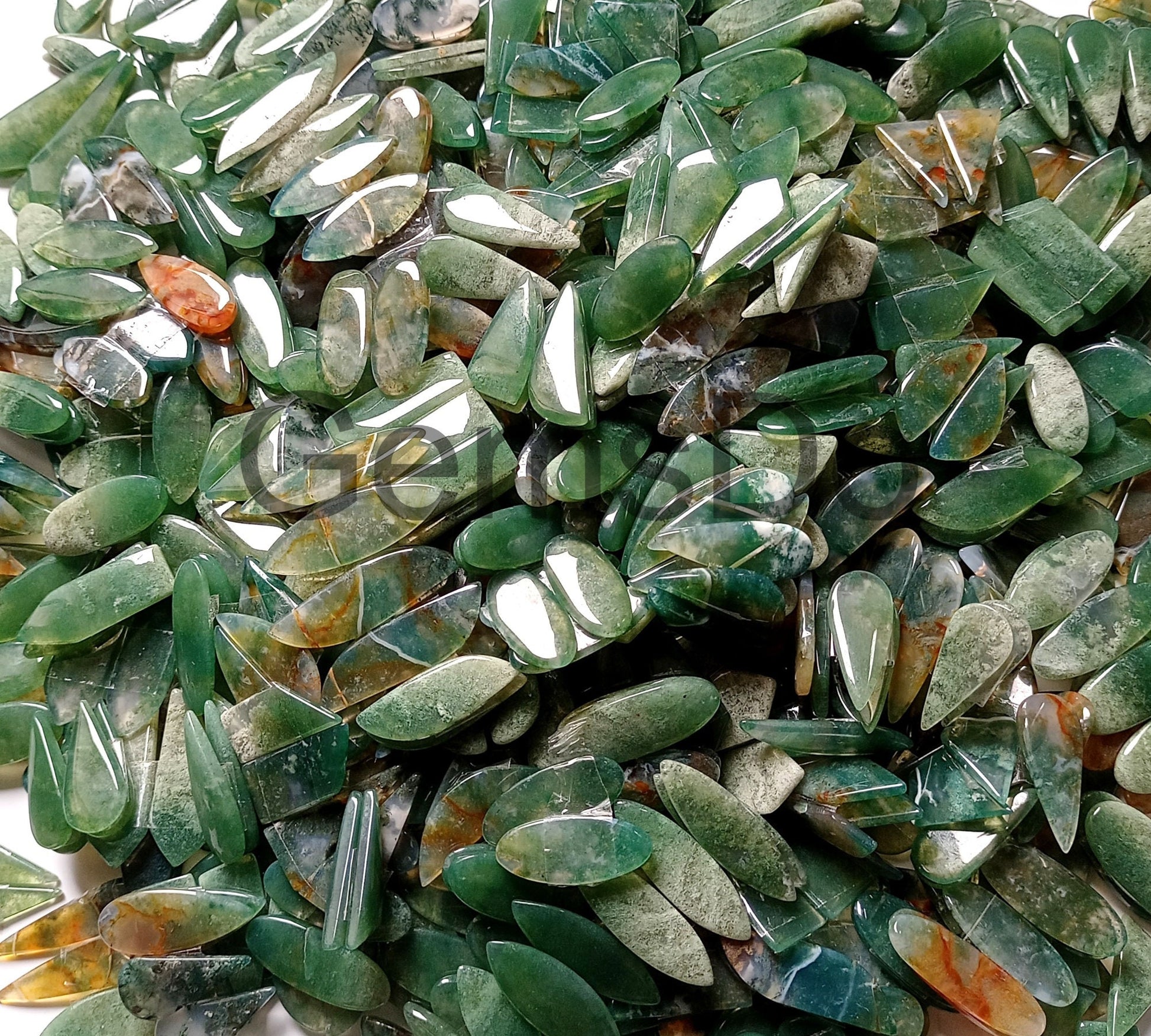 Shop natural Moss Agate mixed cabochon pairs – smooth, polished, and perfectly matched gemstones for earrings, pendants, and custom jewelry making.