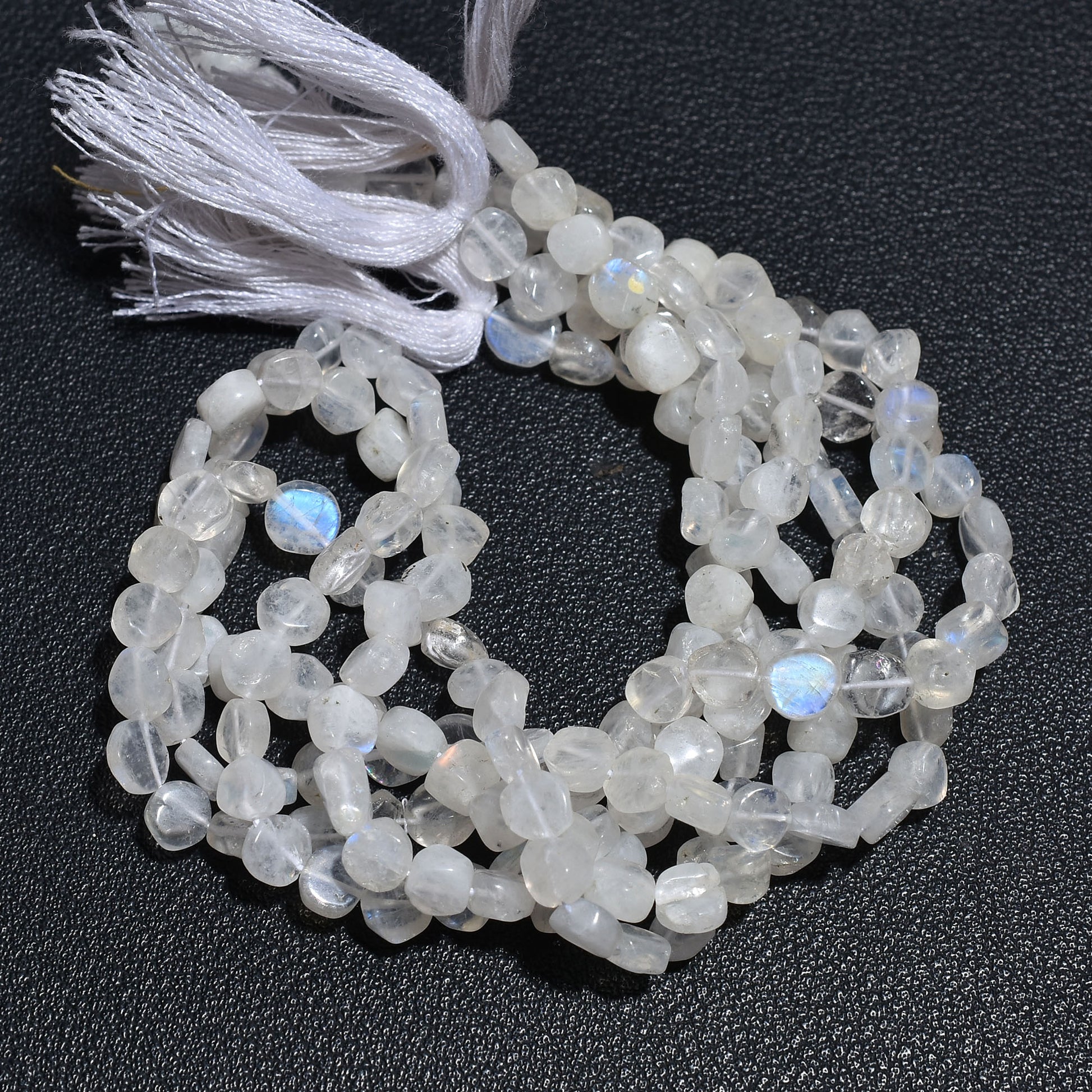 Natural Rainbow Moonstone Coin Beads with smooth polish and blue flash. 5–6mm gemstone crystal strand ideal for necklace, bracelet, and jewelry making.