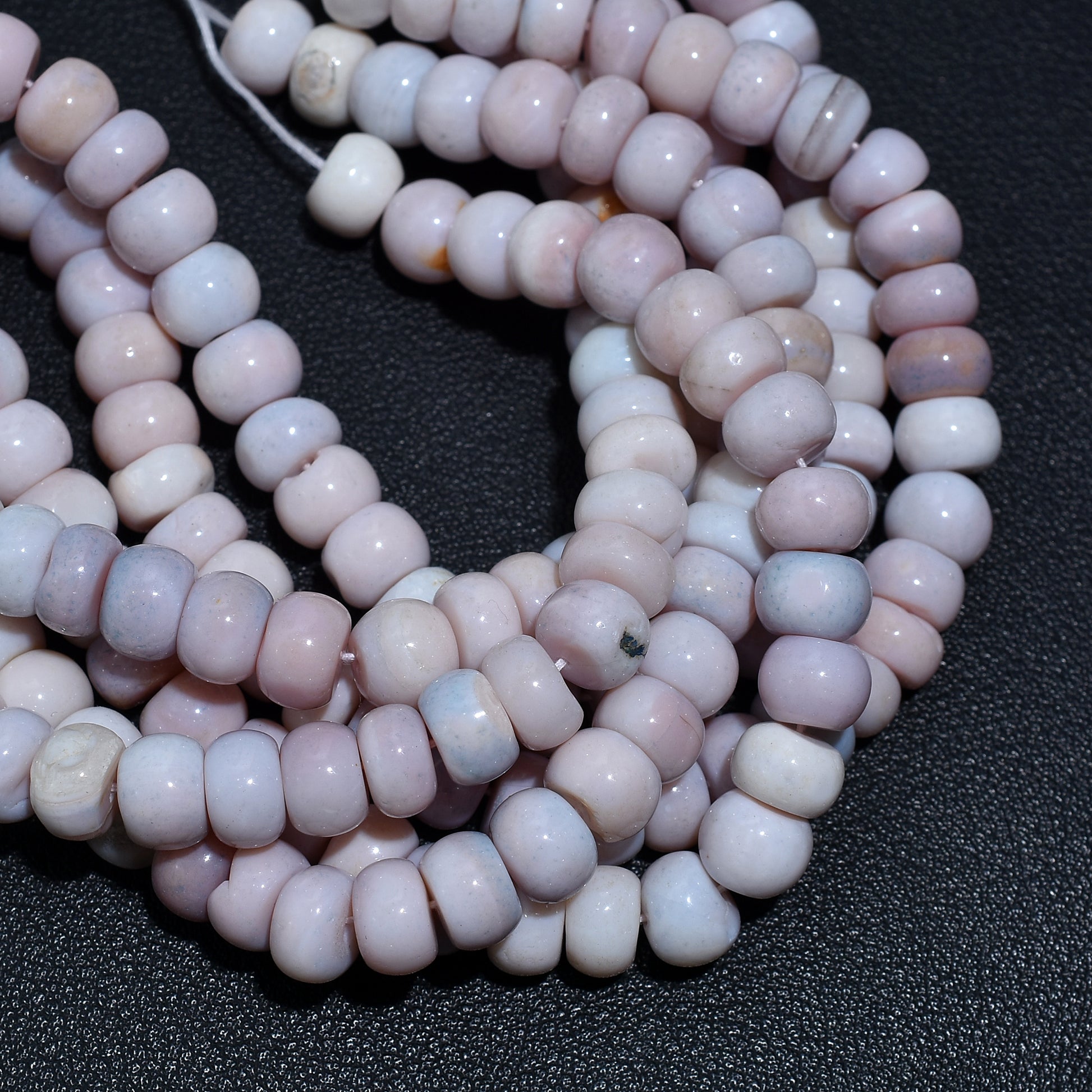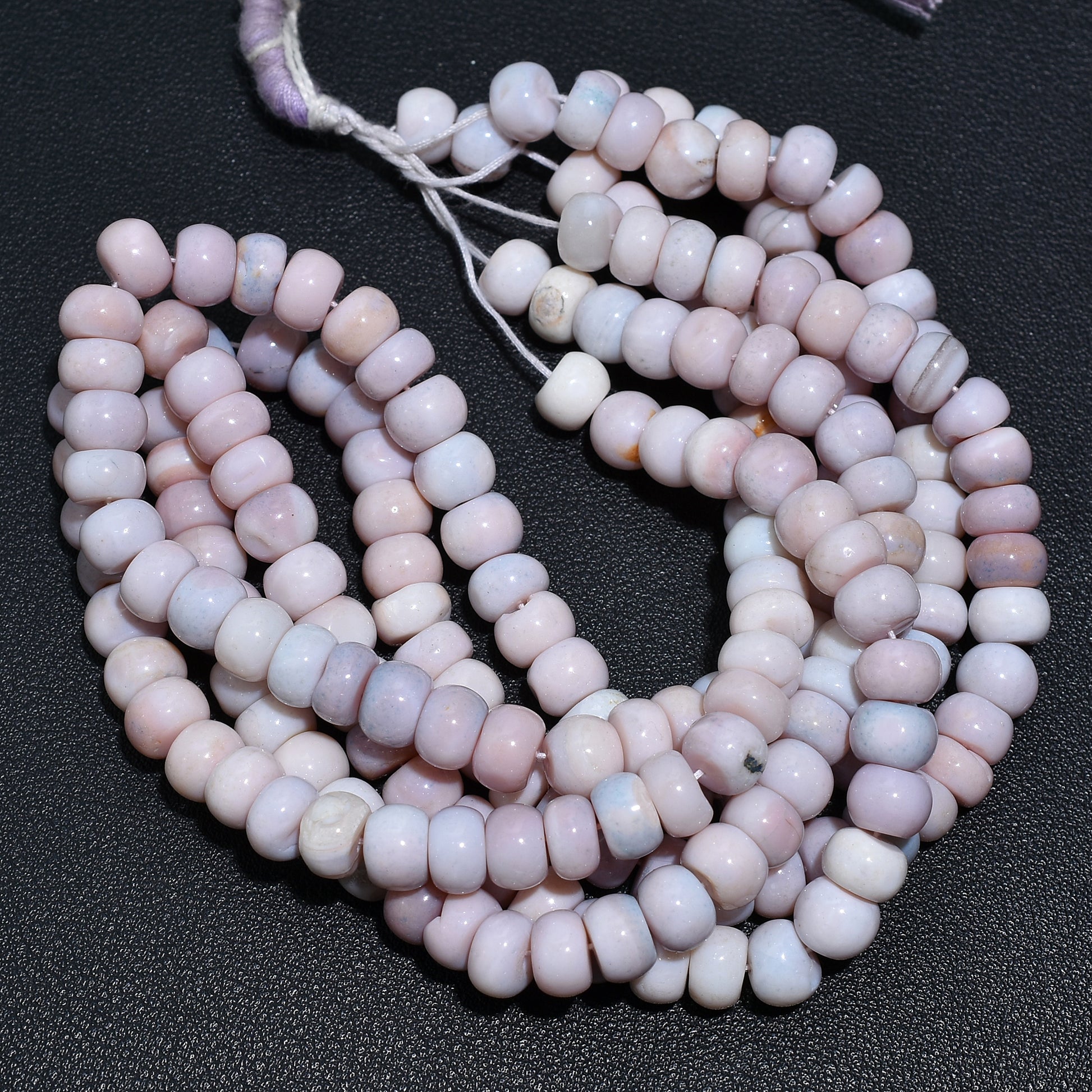 Shop 15 inch strands of natural pink opal rondelle beads. Ideal for making elegant necklaces, bracelets, and healing crystal jewelry. Smooth, polished, and pastel-hued.