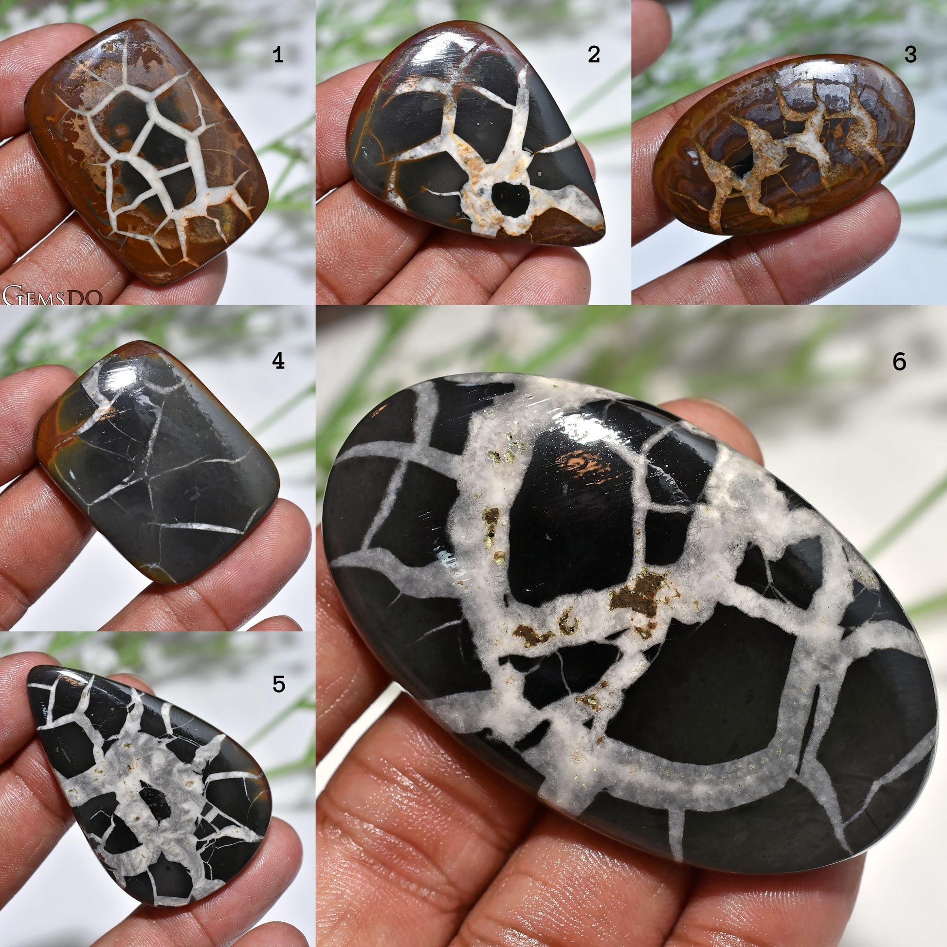 "Explore the unique beauty of Septarian cabochon gemstones, also known as Dragon Stone. These polished stones, featuring striking black nodules, are perfect for pendant creation and are available at wholesale prices for jewelry makers and designers."