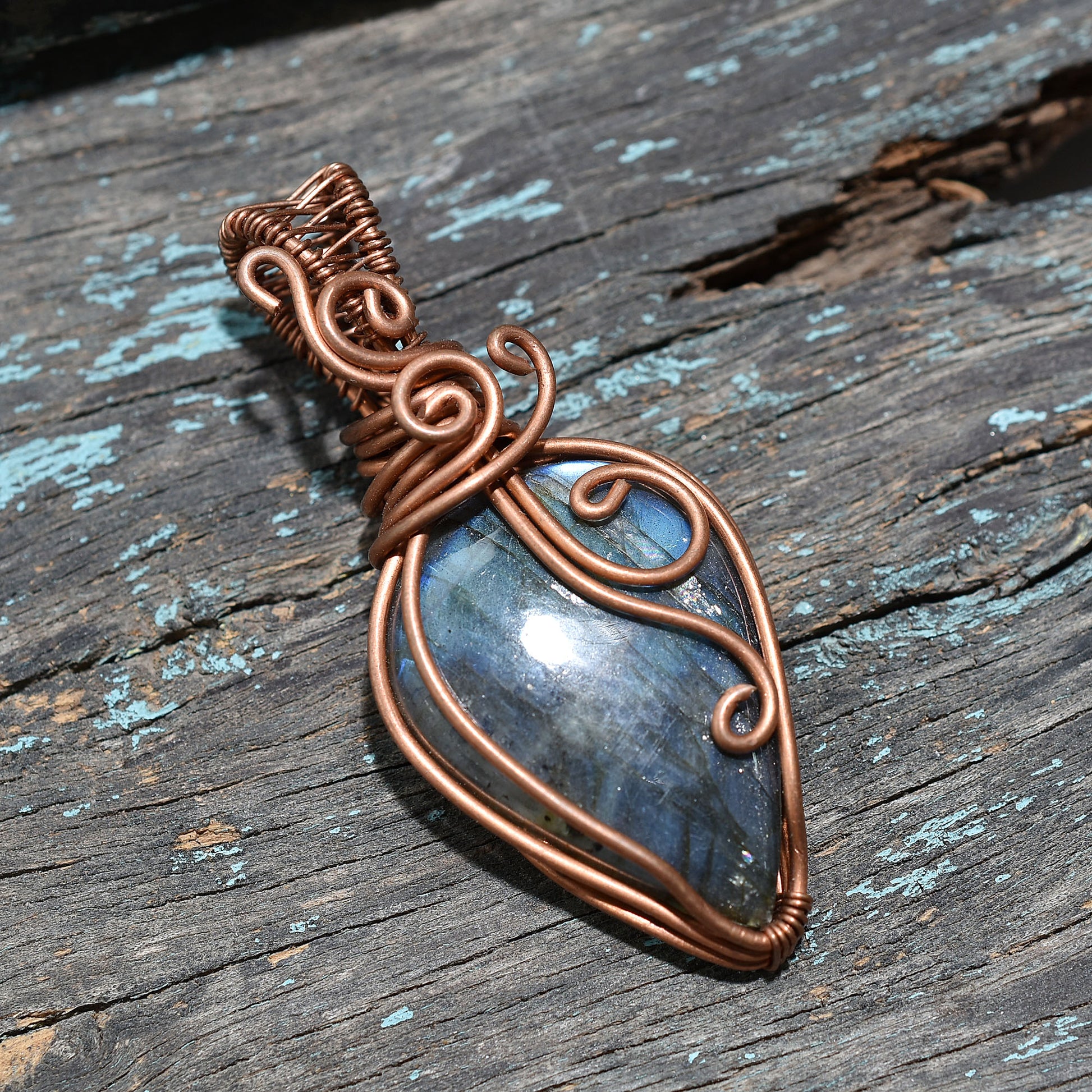 Capture the magic of this flashy Labradorite pendant, wrapped in intricate copper wire. A handmade gemstone necklace for protection, intuition, and unique boho fashion.