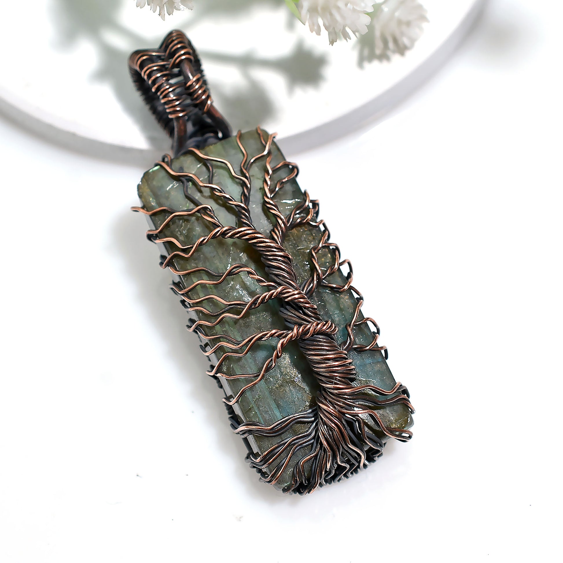 Designed for those who love unique, handcrafted jewelry, this Labradorite pendant radiates healing energy. The wire-wrapped copper setting enhances the natural blue and green flashes of the stone, making it a perfect boho-chic accessory.