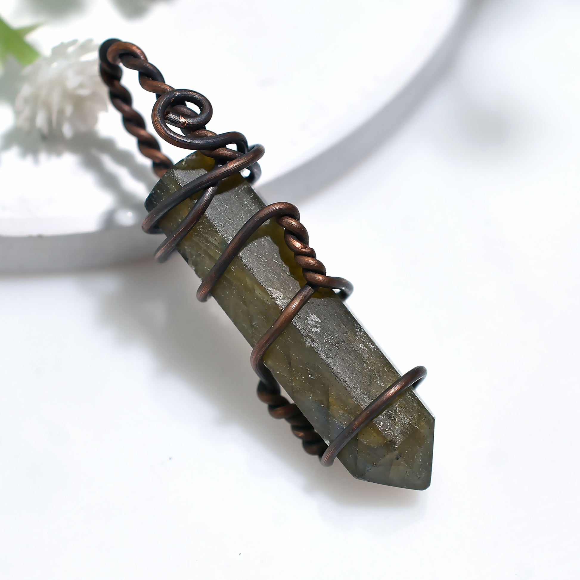 This one-of-a-kind Labradorite pendant is wrapped in hand-oxidized copper, creating a vintage and rustic look. Known for its aura-cleansing and intuitive properties, Labradorite is a powerful stone for protection and balance. This unique necklace makes a wonderful gift for spiritual seekers, yogis, and crystal lovers.